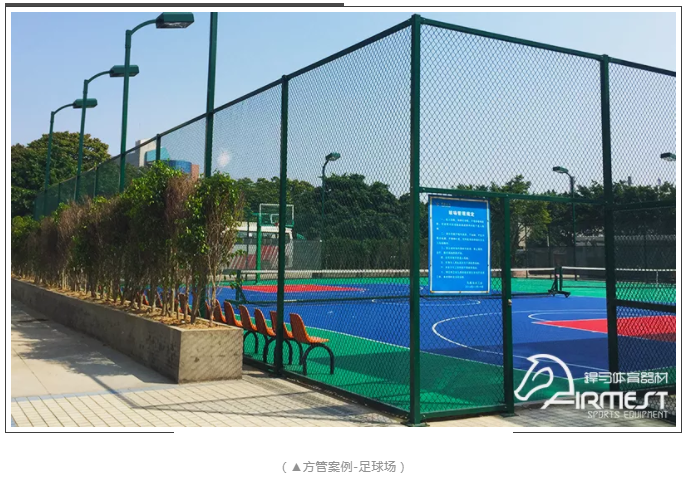 围网系统结合运动抗冲击性和安全性,采用立柱、横杆、围网、扣件专业标准化的参数设计,灵活可拆式结构避免了一次性焊接的种种弊端。